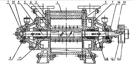 SZ型水環(huán)式真空泵由泵體(1)及兩個側(cè)蓋(2)(3)所組成(圖一)側(cè)蓋下部有泵腳(a)支撐(圖2),在上部是兩管子即進(jìn)氣管(c)和排氣管(f),這兩個管子通過側(cè)蓋上的吸氣孔(d)及排所孔(g)與泵腔相連,泵體上的進(jìn)氣管與排氣管和側(cè)蓋上的吸氣孔及排氣孔相通,軸(4)偏心地安裝在SZ型水環(huán)式真空泵體中,葉輪(6)用鍵(5)固定于軸上。葉輪與側(cè)蓋之間的間隙,用泵體和側(cè)蓋間的墊來調(diào)整總間隙,用軸套(17)推動葉輪,從而調(diào)整葉輪兩端的間隙。此間隙決定氣體在泵內(nèi)由進(jìn)氣口至排氣口流動中損失的大小。 |